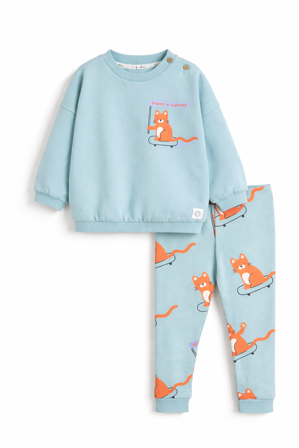 • 2 piece set• Ribbed crew neck• Button fasten dropped shoulder• Long ribbed cuff sleeve• Soft jersey fabric• Ribbed hemline• Elasticated waist• Ribbed printed leg• Cuffed ankle